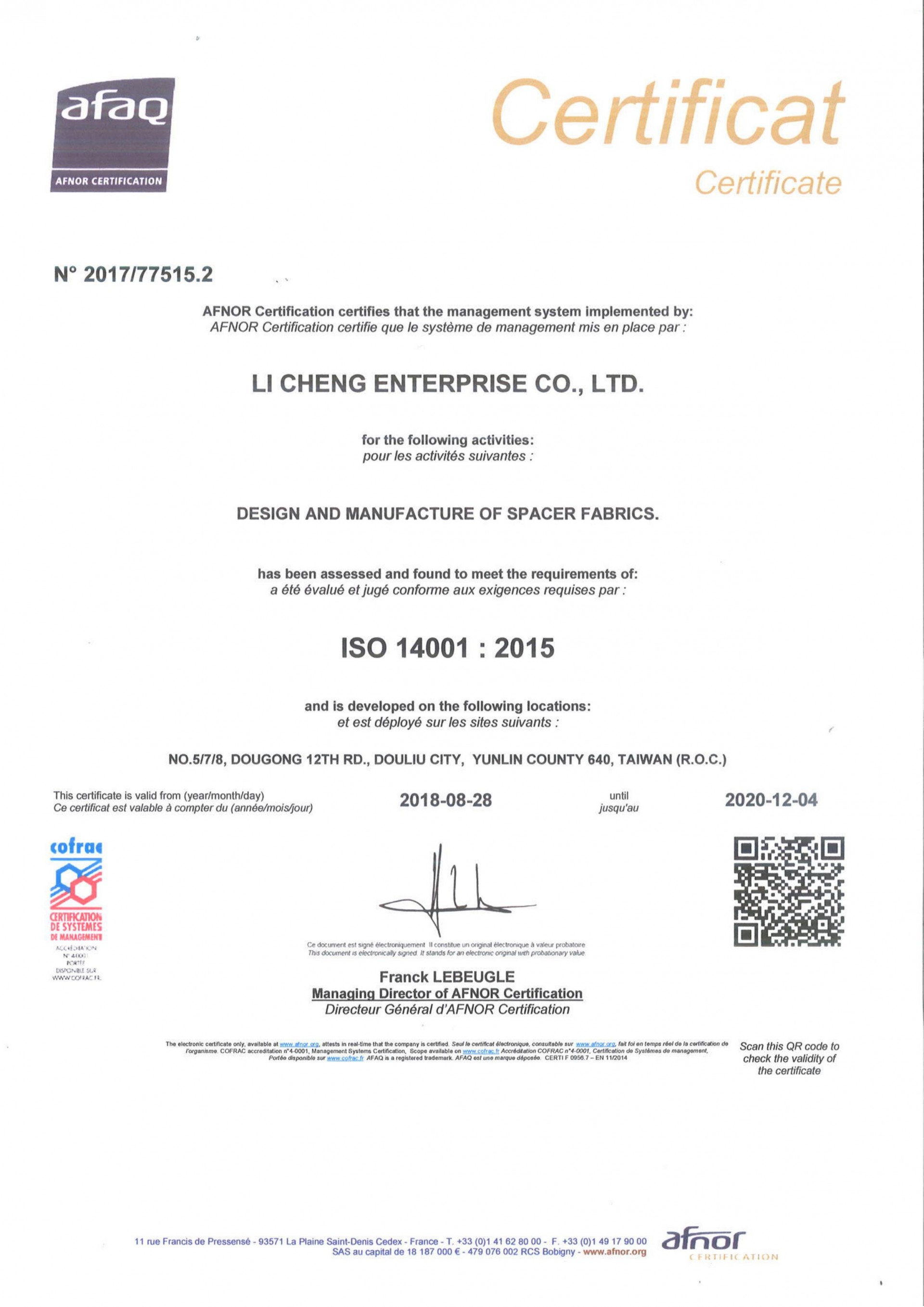 Li-Cheng Enterprise Co., Ltd is specialized in producing of spacer fabrics. Environment protection is the important responsibilities and commitments for Li Cheng Enterprise Co., Ltd. as a world citizen. In order to protect earth environments and do the best to social responsibilities, Li-Cheng Enterprise Co., Ltd commits to employees, customers and the public that all managements are operating by reliable and conformed environmental protection by applying ISO 14001 and implementing throughout to increase environment management performance and continuous improvement.