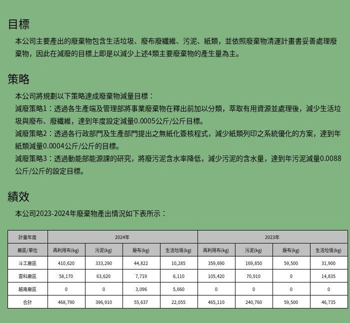 為便於全體員工、客戶與社會大眾了解本公司推動「環境管理系統」落實減廢節能之決心,以上的口號方式表達。為了本公司在綠色產品上的管理,除以上之「環境政策」口號外,本公司為符合環保法規、ISO 14001,我們以下列重點幾項,作為未來的努力方向: