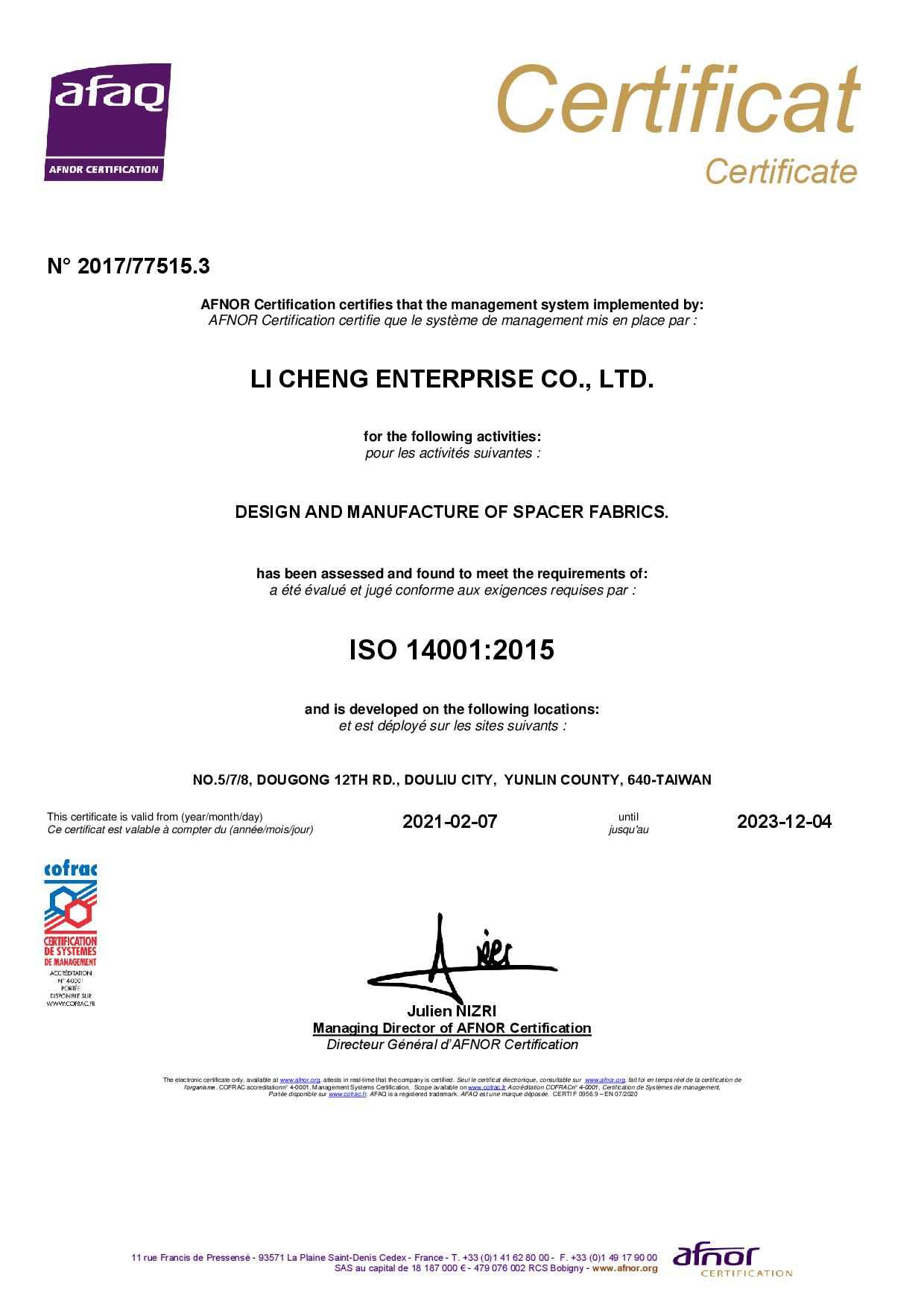 Công ty TNHH Li Cheng Enterprise Việt Nam là công ty chuyên sản xuất vải dệt 3D. Bảo vệ môi trường là trách nhiệm và cam kết quan trọng của Công ty TNHH Li Cheng Enterprise Việt Nam với tư cách là một doanh nghiệp toàn cầu. Để bảo vệ môi trường trái đất và thực hiện các trách nhiệm xã hội của doanh nghiệp. Công ty TNHH Li Cheng Enterprise Việt Nam hứa với tất cả nhân viên, khách hàng và công chúng rằng mọi hoạt động quản lý sẽ được thực hiện một cách đáng tin cậy và thân thiện với môi trường, nâng cao hiệu quả quản lý môi trường và tiếp tục cải thiện thông qua việc áp dụng và triển khai hệ thống quản lý môi trường ISO 14001.